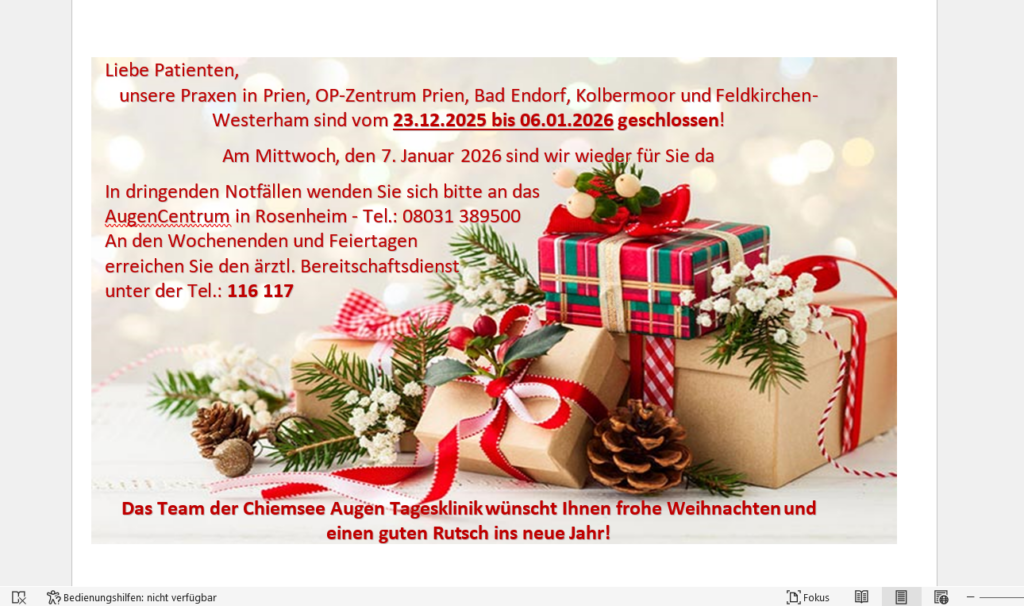 Die Chiemsee Augen Tagesklinik ist eine Inhaber geführte, augenärztliche Gemeinschaftspraxis, die sich mit sämtlichen Erkankungen des Auges befaßt.